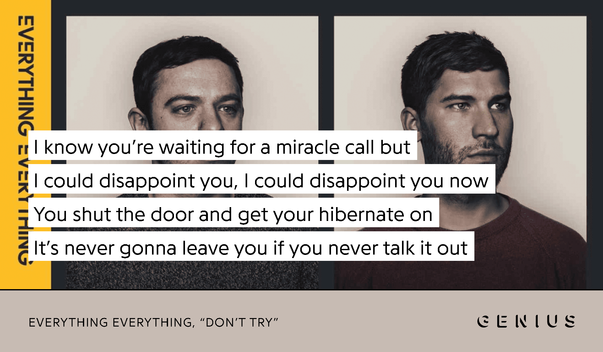 Lyrics from Everything Everything’s song ‘Don’t Try’: “I know you’re waiting for a miracle call but/ I could disappoint you, I could disappoint you now/ You shut the door and get your hibernate on/ It’s never gonna leave you if you never talk it out”.